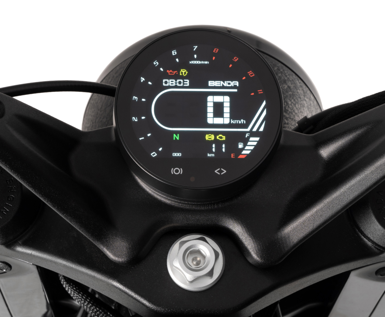Step into the future with the Napoleon Bob 500 color TFT dashboard. Our photo showcases its clear, minimalist UI design, demonstrating Benda’s commitment to providing an informative and easy-to-navigate control hub for riders.