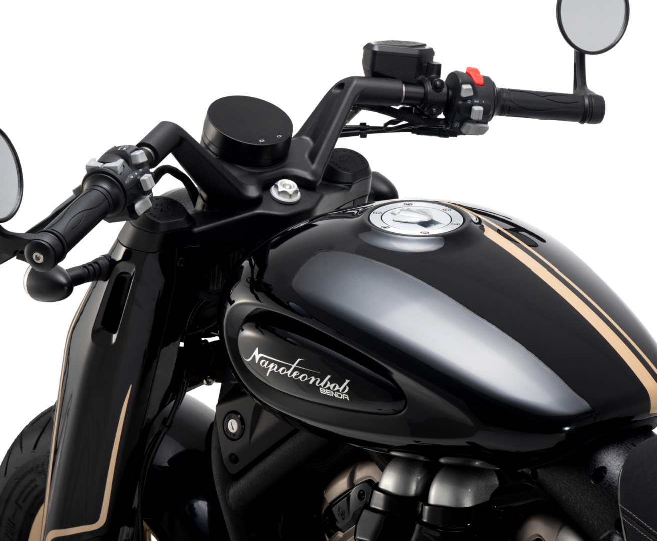 Dive into the intricacies of the Napoleon Bob 500 design with this photo highlighting the ‘Flying Wing’ handlebars, illuminated buttons, and floating central odometer. These artistic masterpieces not only command attention but also provide an elevated user experience.
